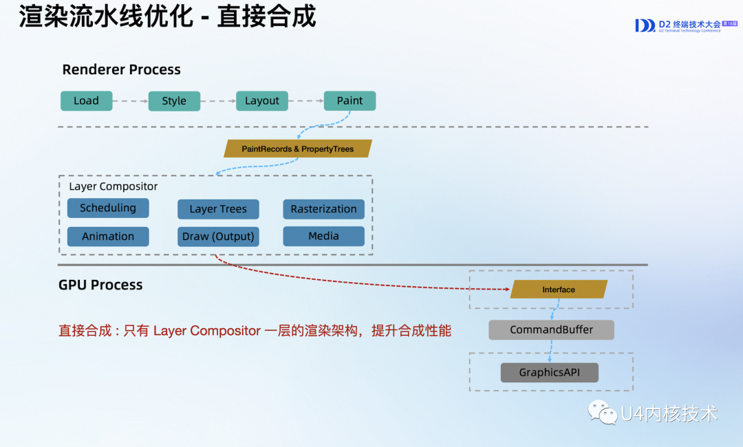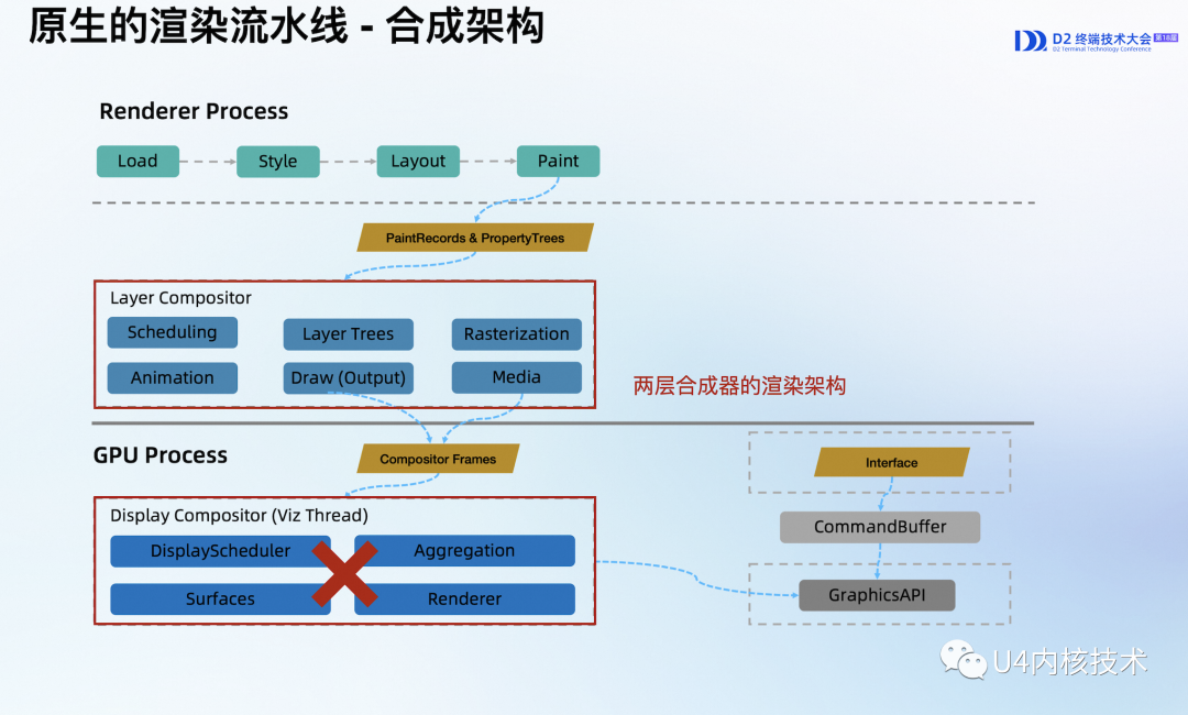 我们再继续看看原生的渲染流水线,可以很明显看到它有 Layer Compositor 和 Display Compositor 两层合成器。Layer Compositor 负责网页合成,Display Compositor 负责与自绘 UI 做二次合成。在 Chrome 浏览器场景,它有很多自绘 UI 控件,这些 UI 控件需要与网页内容一起合成展示,所以它需要 Display Compositor 来做二次合成。但是,在 U4 WebView 普通网页浏览的场景,我们仅仅只需要合成网页,并不需要 Display Compositor,这种两层的合成器架构明显是偏重的,所以我们期望能简化合成器的架构。