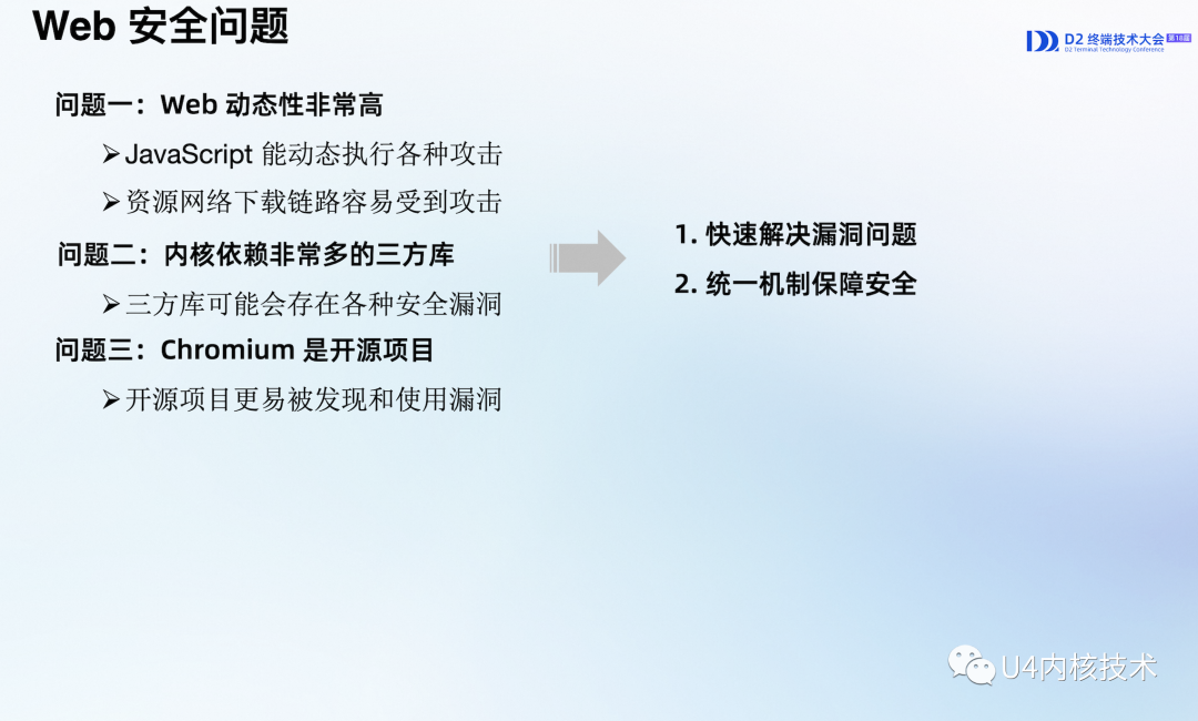 Web 安全技术,我们先看看 Web 安全有哪些问题,一个是 Web 的动态性非常高,页面很容易通过 JS 执行攻击,一个是内核依赖比较多的三方库,这些三方库可能会存在安全漏洞,比如最近爆出的 WebP 安全漏洞,还有就是 Chromium 内核是开源的,开源项目如果存在漏洞会更容易被发现和利用。针对安全漏洞,一方面,我们会快速修复漏洞问题;另一方面,我们期望能有一套统一的安全机制来保障安全。
