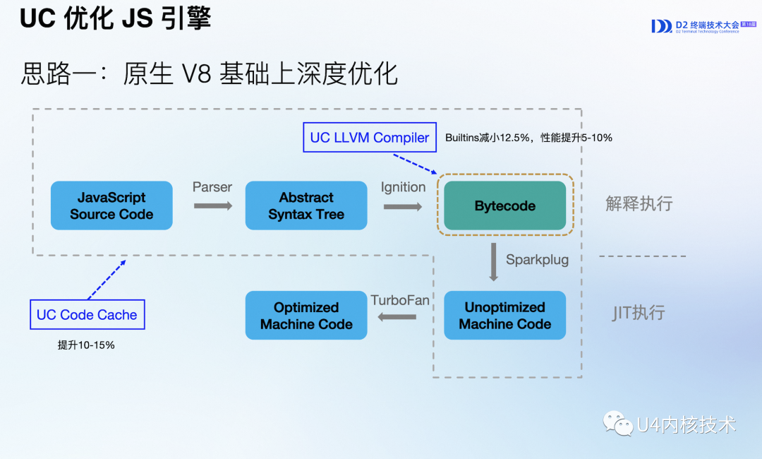 下面我们看看 UC 内核团队是如何去优化 JS 引擎的。第一个思路是在原生 V8 JS 引擎的基础上进行深度优化。从前面我们了解到字节码有比较好的效果,那么我们是否能继续优化字节码呢?为了加快字节码的解释执行速度,我们将 V8 本地编译生成的字节码处理程序 Builtins 的优化编译器 TurboFan 换成了 UC LLVM Compiler。使用 UC LLVM Compiler,可以让 V8 的 Builtins 大小减少 12.5%,性能提升 5-10%。同时我们针对整个 Code Cache 链路做了进一步优化,在保存时机、保存策略、代码质量和覆盖场景等方面都做了较多优化,整体性能比原生 Code Cache 能提升 10-15%。