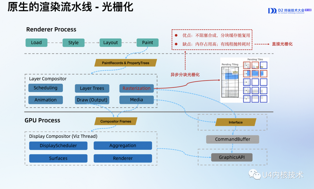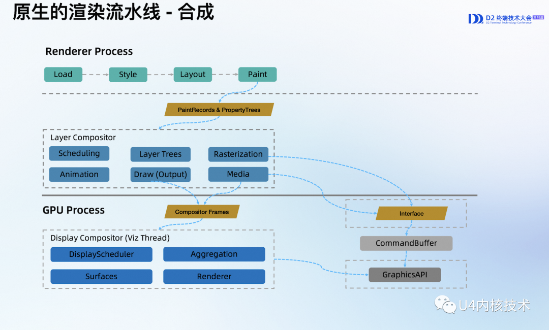 我们先看看原生的渲染流水线,内核在加载、解析、排版、绘制之后会产生 MainFrame。MainFrame 里包含了 PaintRecords 等绘制信息,这些信息会提交给 Layer Compositor。Layer Compositor 是图层合成器,图层合成器负责网页的合成,Layer Compositor 的 Draw 会产生 Compositor Frames。Compositor Frames 里包含了 RenderPass、DrawQuads 等信息,Compositor Frames 会提交给 Display Compositor。Display Compositor 是显示合成器,显示合成器会进一步与自绘 UI 做二次合成。Display Compositor 产生的绘制指令会提交给 GPU,GPU 调用图形库接口去绘制和上屏。