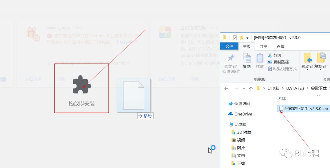 第四步:把刚才下载的谷歌助手拉倒扩展程序里面(拉取过程中一定要放到想应得位置)
