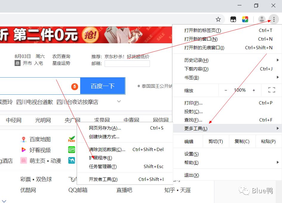 第三步:打开谷歌浏览器(点击右上角三个点如图再点击更多工具选择扩展程序,如图)