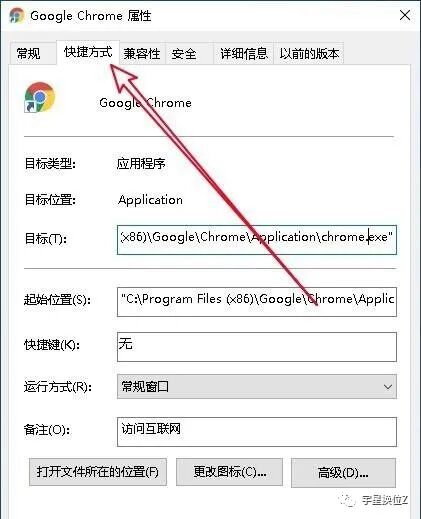 2、然后在打开的谷歌浏览器属性窗口中点击快捷方式的选项卡。