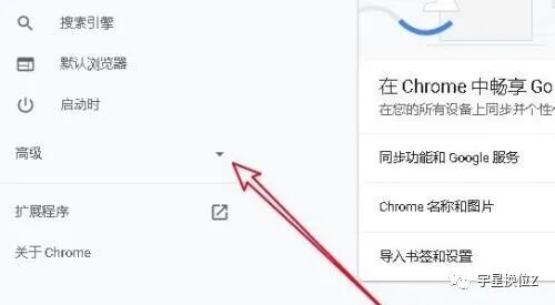 3、在打开的谷歌浏览器设置窗口中,点击左侧边栏的高级下拉按钮。