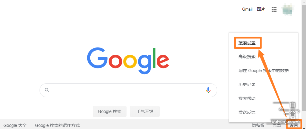 不需要借助浏览器扩展程序等工具,就可以实现。先在Chrome浏览器中登录您的Google帐号,进入 https://google.com/页面,点击右下角的设置-搜索设置,如下图所示: