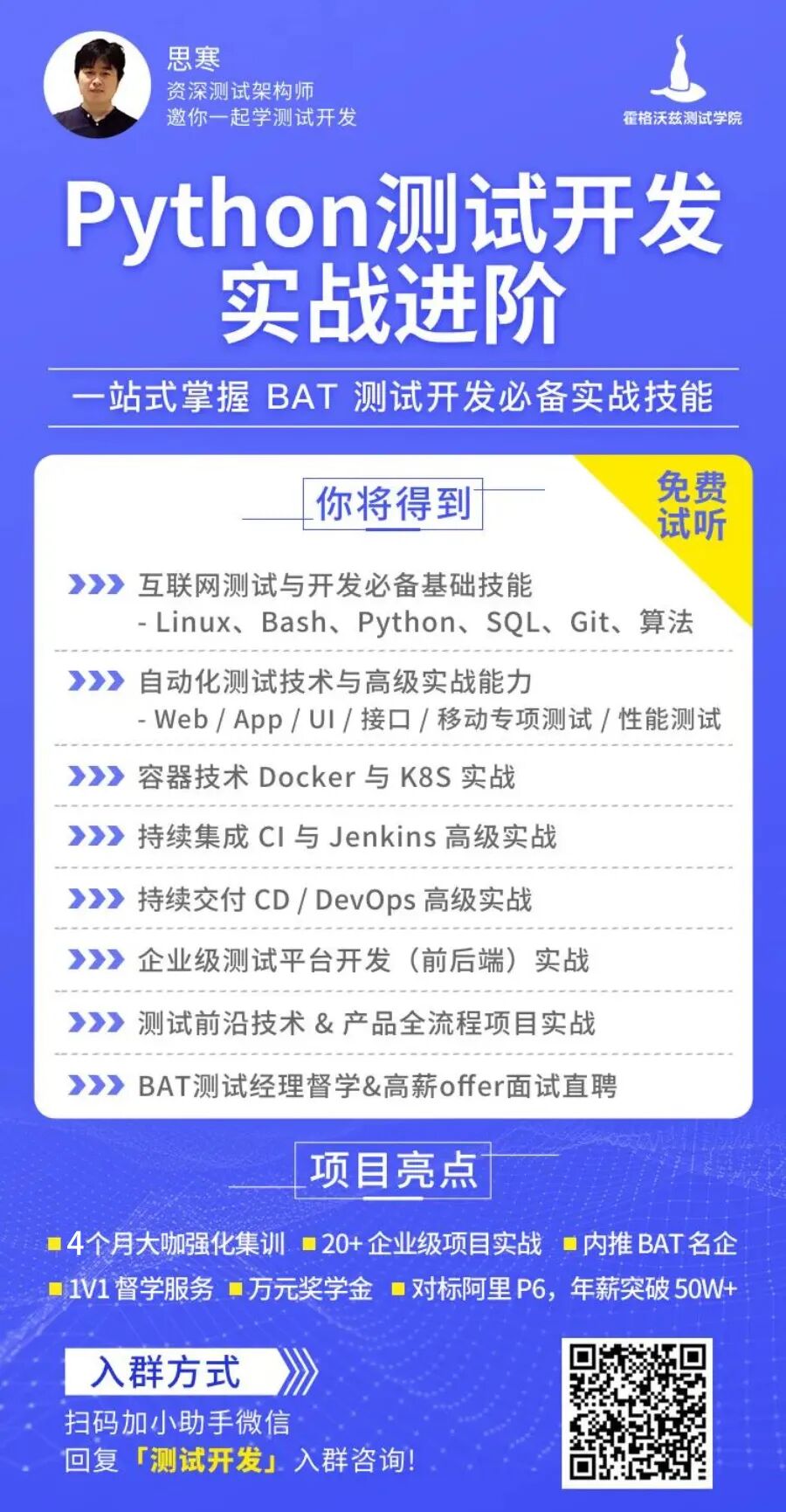 内容全面升级,4 个月 20+ 项目实战强化训练,资深测试架构师、开源项目作者亲授BAT 大厂前沿最佳实践,带你一站式掌握测试开发必备核心技能(对标阿里P6+,年薪50W+)!直推 BAT 名企测试经理,普遍涨薪 50%+!