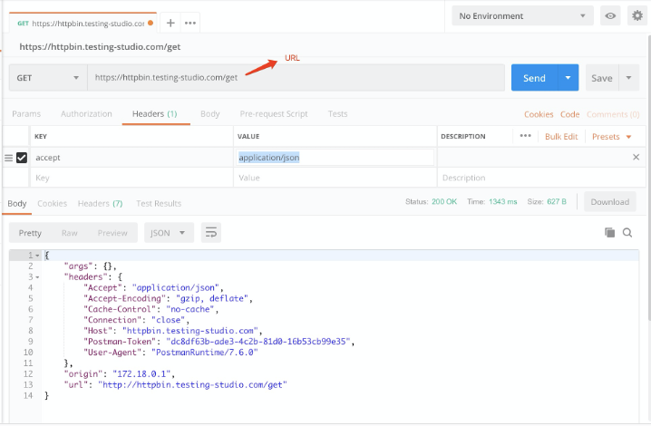 下面使用postman发送一次get请求。使用学院官方演练地址https://httpbin.testing-studio.com/,进行演示