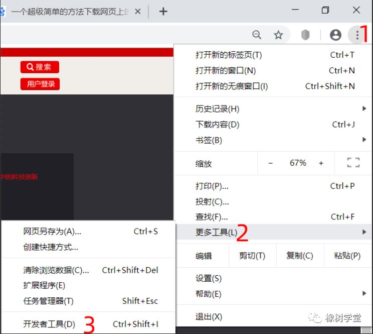 点击右上方的扩展选项按钮(三个点),选择更多工具—>开发者工具