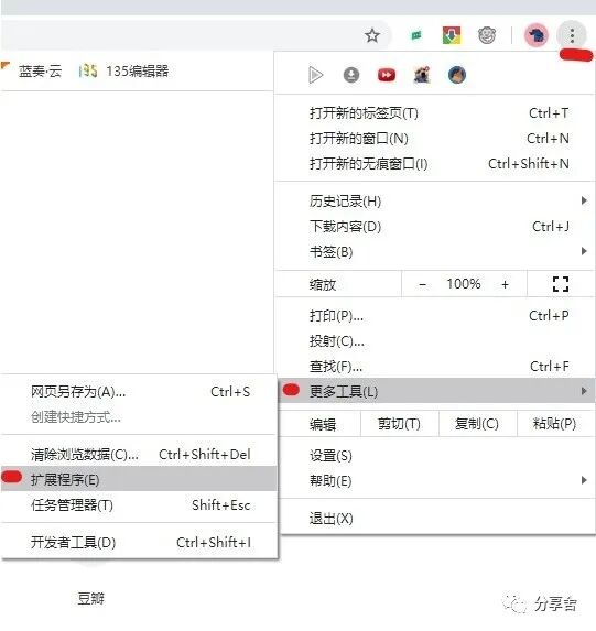 1. 点击 右上方三个点———更多工具————扩展程序