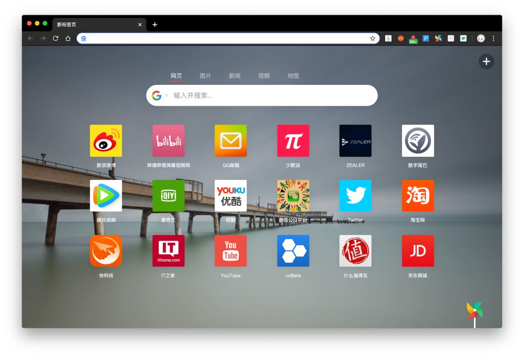 这款插件主打简约风格,页面由搜索栏以及以图标形式呈现的网站快链。