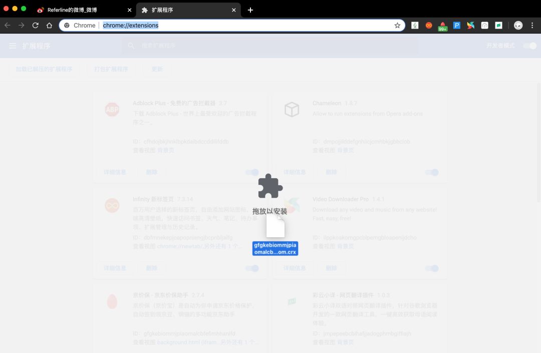 安装插件时在浏览器中点击「更多工具」-「扩展程序」或在浏览器地址栏中输入chrome://extensions/都可以直接到达安装页面,将下载好的 .cxr 文件拖到浏览器中即可完成安装。