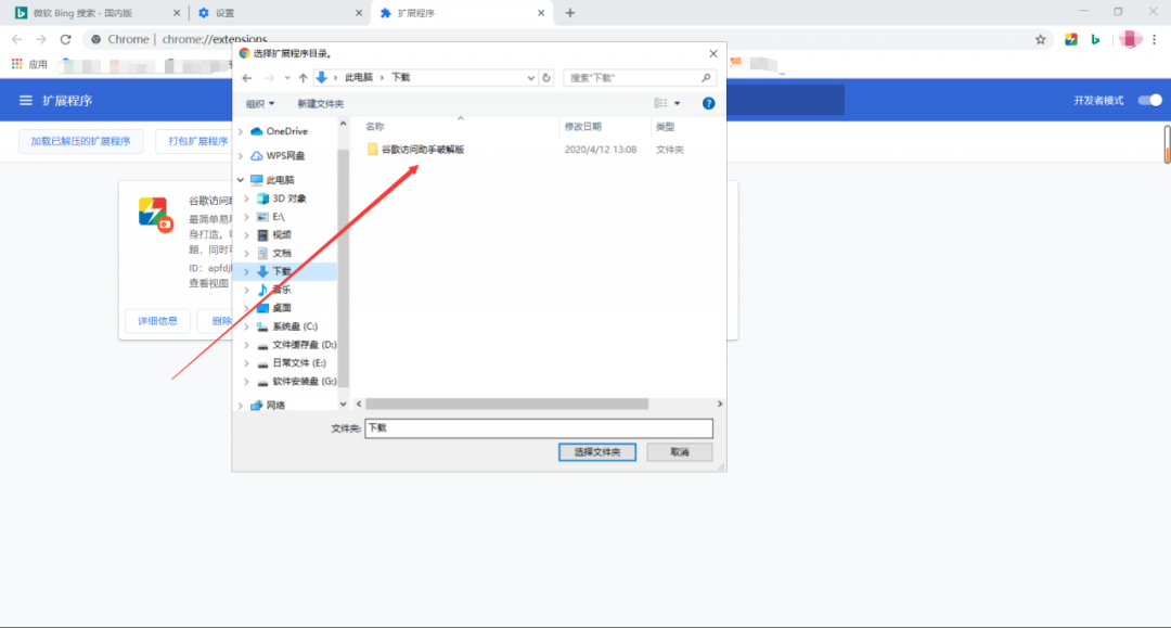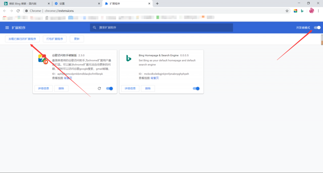 在这我们要注意一个地方,我们需要点击打开右上角的开发者模式,然后再点击加载已解压的拓展程序!最后点击你解压后的谷歌访问助手就可以啦!