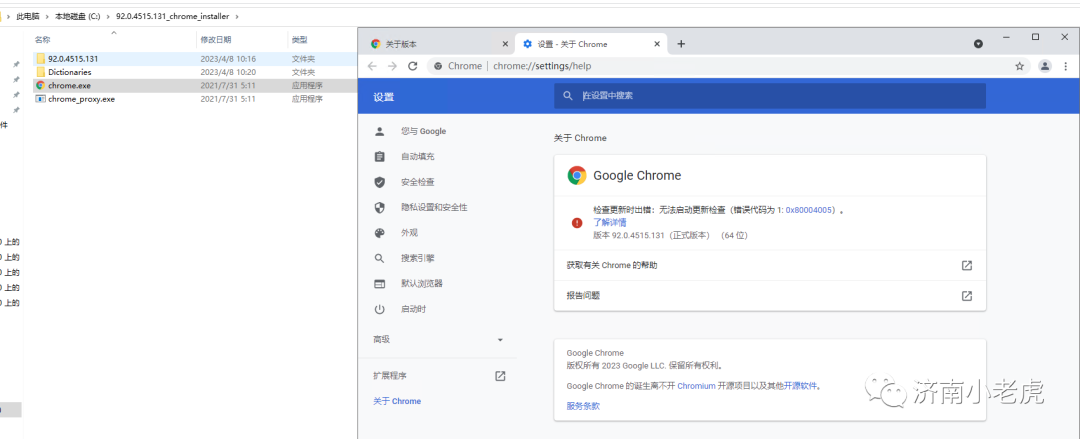 找一台Windows机器下载部分版本的Chrome浏览器. 建议离线下载, 使用 exe文件进行下一步的处理.92.0.4515.131_chrome_installer.exe注意需要使用这种类型的安装文件. zip包模式的不能解压缩.解压缩进行验证