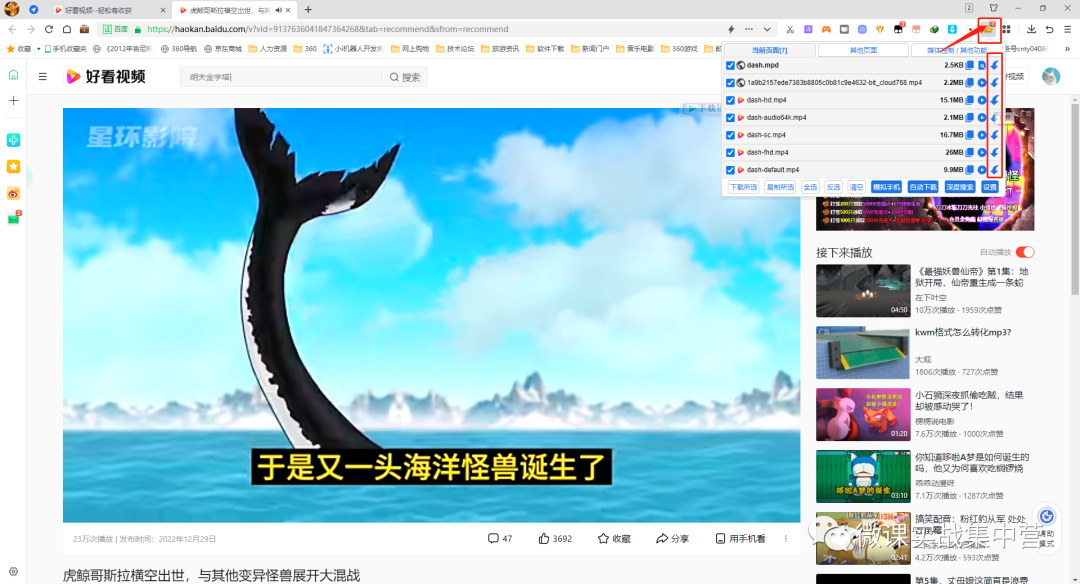 在浏览器安装后右上角就是这个小猫的图标,如果当前网页有音视频类型的文件,它就会直接解析出现,图标旁边的数字就是抓取到的资源数。