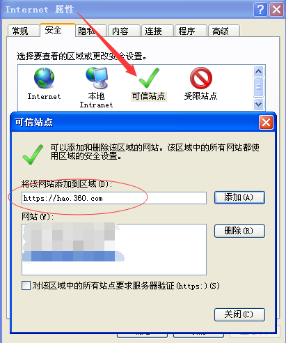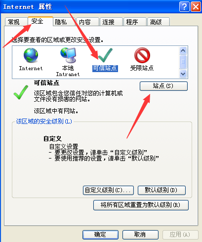 然后点击安全→可信站点→站点。如图所示:
