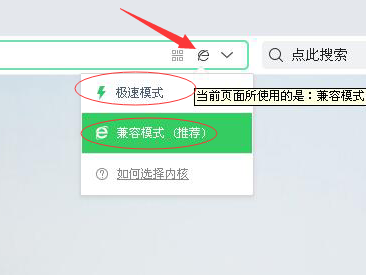 技巧二:通过选择合适的模式来解决一些浏览器一些常见的问题。首先我们打开360浏览器,打开浏览器之后,点击地址栏右边的一个图标,如红色箭头所指。点击打开会显示两种模式,分别为极速模式和兼容模式。如图所示:
