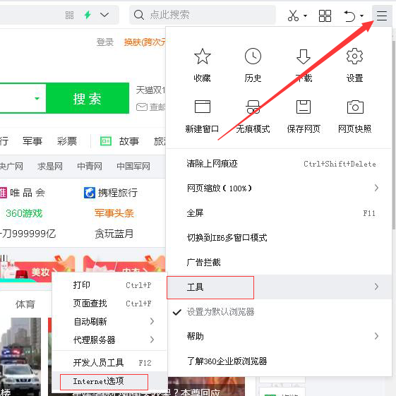 打开浏览器点击红色箭头所指,依次打开工具→Internet选项。如图所示:
