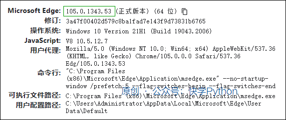 我们可以直接下载Edge浏览器对应版本的驱动,下载步骤和Python代码量与谷歌浏览器基本一致。浏览器地址栏输入edge://version/回车可以查看Edge浏览器版本。