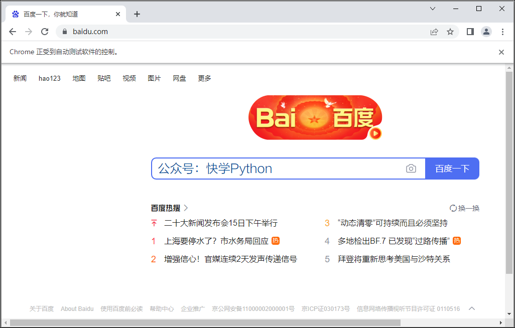 fromseleniumimportwebdriver创建ChromeDriver实例,启动Chrome浏览器driver = webdriver.Chrome()driver.get(https://baidu.com/)输出结果如下所示,会看到成功打开谷歌浏览器并打开百度首页,此时便可以继续用selenium自动化操作谷歌浏览器了。