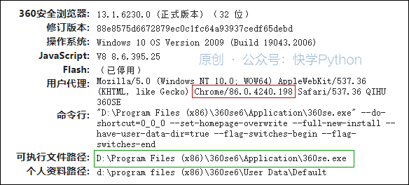 确定自己360浏览器的版本号后,按照版本号下载对应的浏览器驱动,并将chromedriver.exe文件放到Python安装目录下。这里与常规谷歌浏览器一致,不再赘述。
