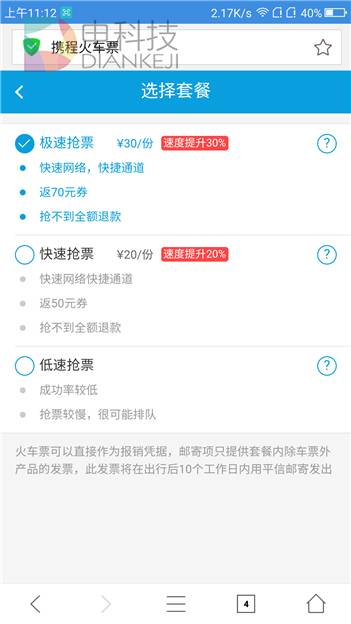 最后,用户还可以额外支付费用加速抢票,号称20元提速20%,30元提速30%,使用加速的话会返还不同额度的优惠券,抢不到票的话也会全额退款,这样的增值服务对大多数人来说不难接受,而因为是携程提供的服务,支付形式也相应有所增加,储蓄卡、信用卡、微信、支付宝、百度钱包,应该是涵盖了目前所有主流的移动端支付方式。