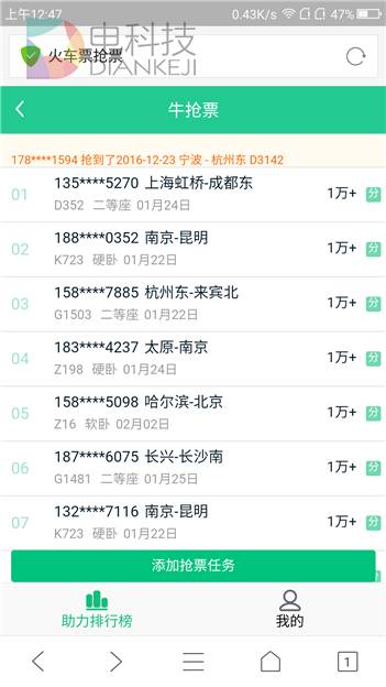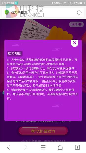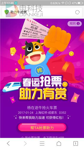 比较有意思的是,QQ浏览器牛抢票额外推出了助力牛抢票这种偏娱乐化的活动,从活动规则看,主要意义是助力其他用户抢票有机会兑换途牛旅游优惠券,自己的抢票任务被他人助力后可获得0.1元,满5元可获得奖励,坦白说,这样的活动并没有多少吸引力,尤其是在紧张繁忙的春运期间,你真的有心思去凑50个0.1元来换5块钱的优惠券吗?