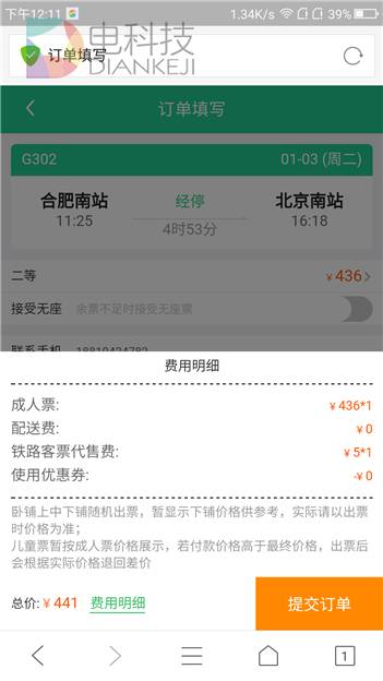 QQ手机浏览器火车票价格明细