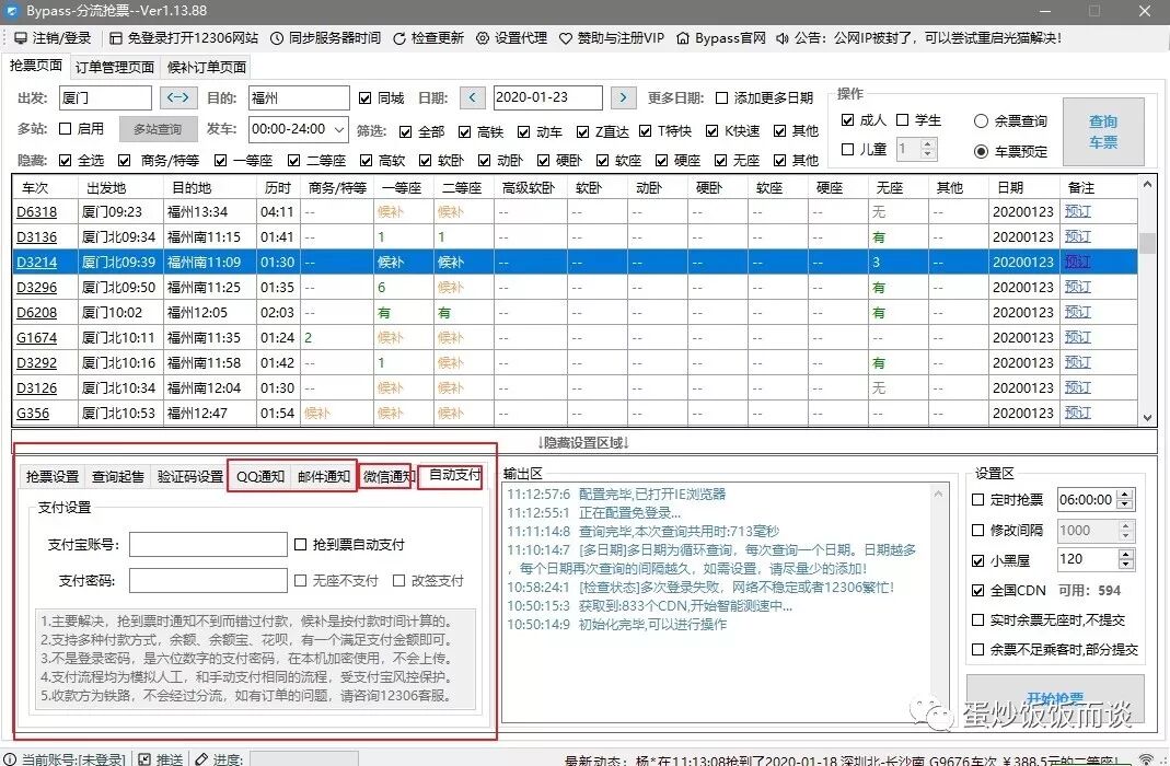 一些其他的功能,比如多站查询,QQ微信邮件通知、自动支付(不推荐)、定时抢票(这个好)。