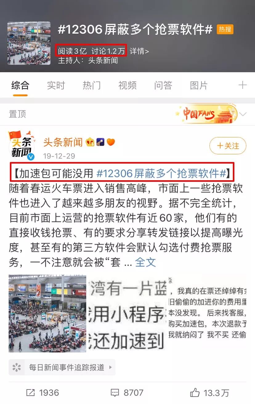 12306 屏蔽了多个抢票软件,这一话题,一度还上了微博热搜,阅读量达3亿之多。