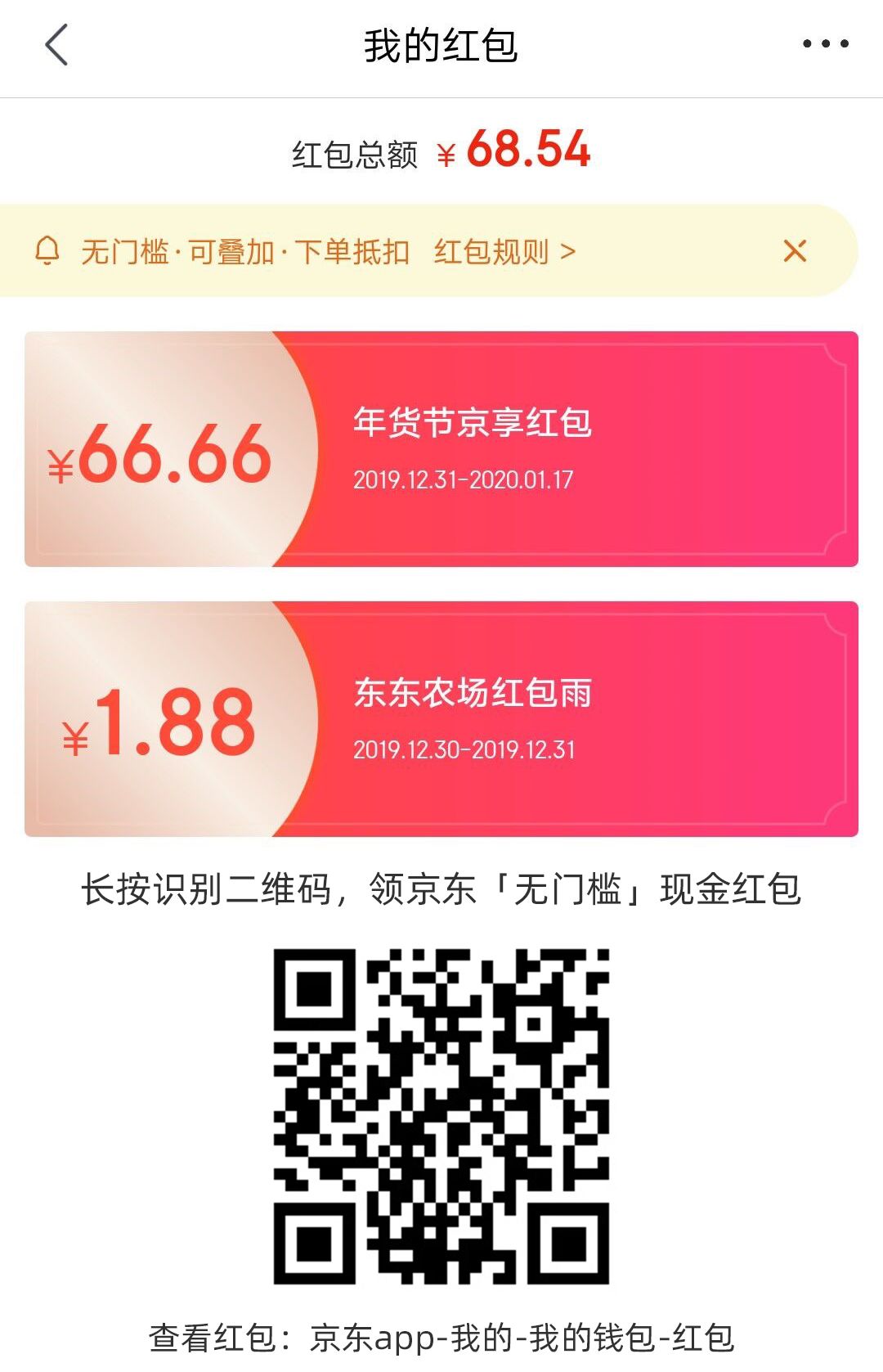 有人领到了66.66现金红包!京东「无门槛」现金红包又来啦!即日起到1.12,每天可领3次,长按识别下方二维码,试试你的运气。