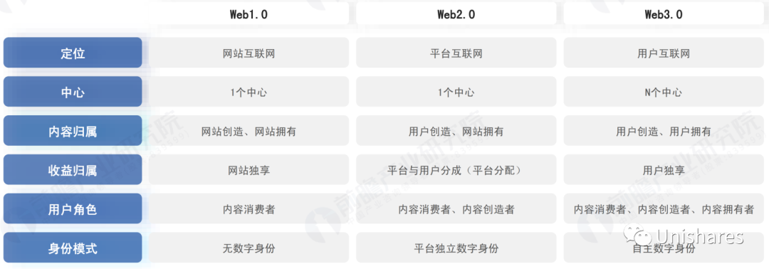 Web1.0- Web3.0 ,是互联网由网站互联网向用户互联网发展的过程。特征的主要区别在于是否去中心化,内容和收益的归属和分配,用户角色的变化以及身份模式的演变。