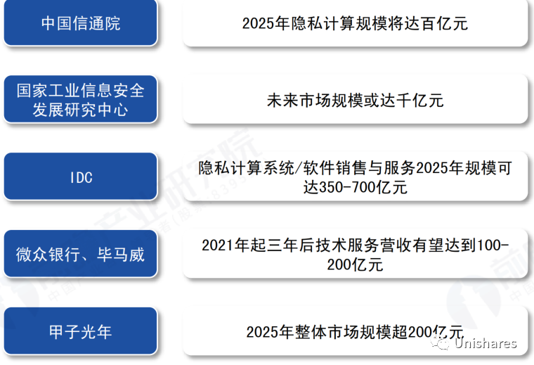 近年来,隐私计算技术和产业逐渐火热,被视为解决数据要素流通难题的关键技术。但目前对于市场规模暂形成普遍共识,但多家机构对于未来发展持乐观态度,预测未来规模将超百亿元。未来,隐私计算将在技术方面融合,应用也由传统场景延展至新兴场景,行业进入快速成长期。