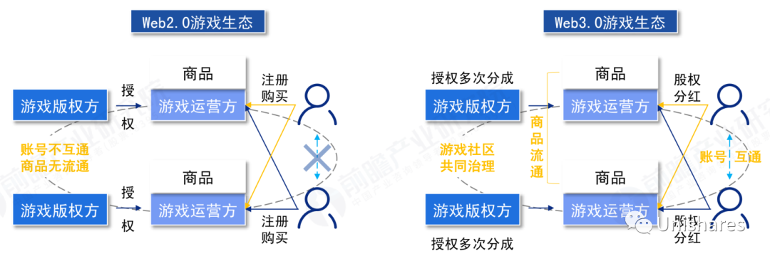 从传统游戏到Web3.0游戏,游戏发行方和玩家的关系从企业与消费者转变为利益共同体的关系。在传统游戏中,游戏发行方为玩家提供游戏娱乐体验从而获取收益。在Web3.0游戏中,资产增值带来的收益由玩家、游戏发行方与通证持有者共同所有。游戏发行方不再独享游戏收益,而是从游戏内经济活动的活跃性中获取税费。玩家作为游戏生态的重要参与者,在获取娱乐价值的同时拥有所持资产的潜在增值空间。2022年12月, Web3.0游戏的市场规模已突破100亿美元,与游戏资产相关的总交易量超过2000万美元。