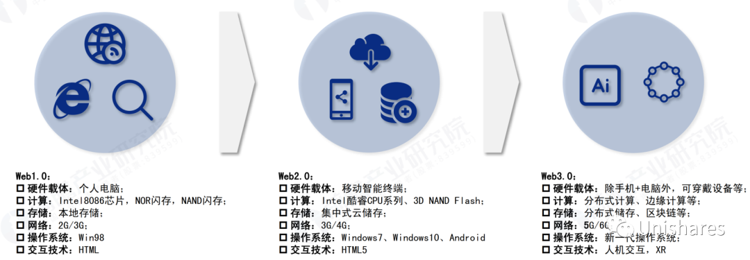 Web1.0- Web3.0 的技术演进,从硬件载体、计算、存储、网络、操作系统和交互技术方面迭代。最核心的部分是在Web3.0时代,进行区块链技术的革新,以及分布式计算、储存的突破等。