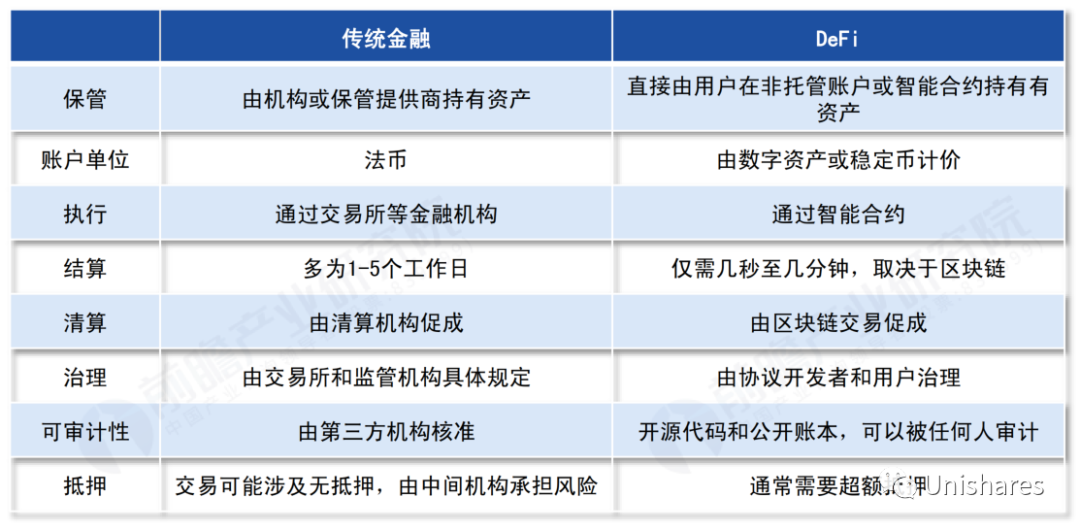 与传统金融相比, DeFi仅通过智能合约技术,普通用户之间就可以实现直接交易,实现传统金融机构各种功能,如衍生品、借贷、交易、理财、资产管理等,交易效率大幅提升,成本也对应下降。DeFi目前的发展瓶颈是实体经济如何通过虚拟的金融体系被所有人认可,从而实现大规模应用。