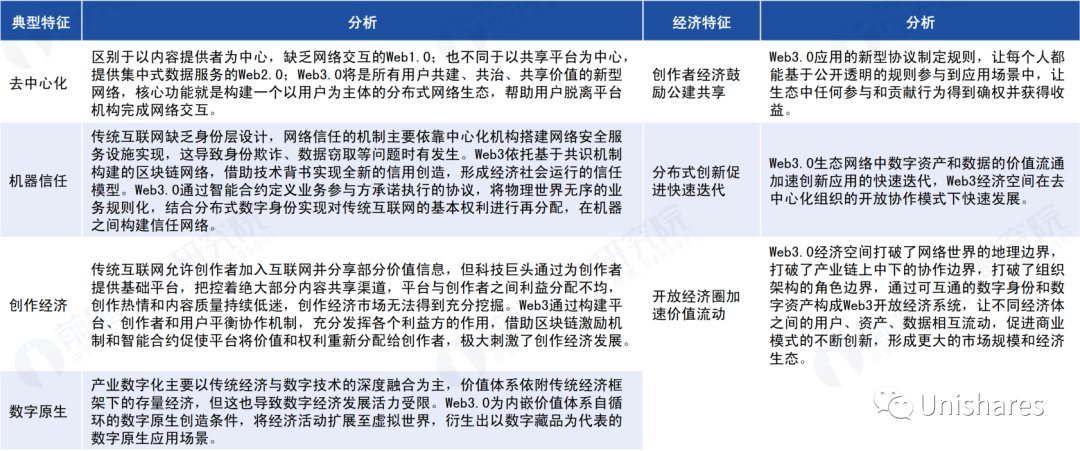 Web3.0的典型特征包括去中心化、机器信任、创作经济和数字原生;经济特征包括创作者经济鼓励公建共享、分布式创新促进快速迭代、开放经济圈加速价值流动。