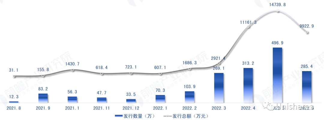 国内数字藏品市场发展迅速, 2021-2022年单月发行数量和发行总额环比增势迅猛。2022年5月为发行总额单月最高,达到1.47亿元,发行量也达到496.9万峰值。
