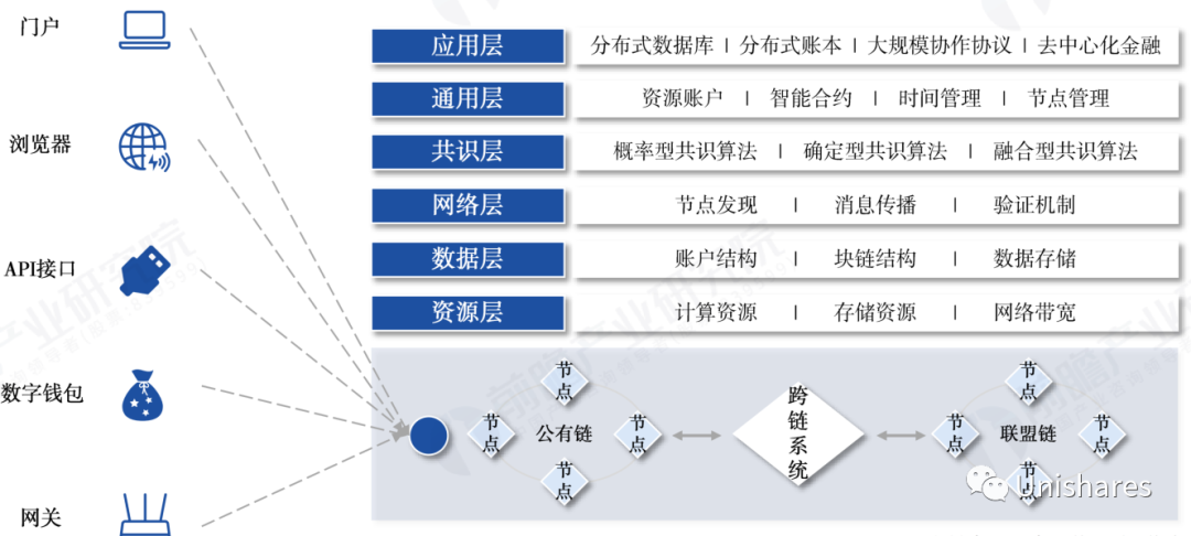 区块链作为Web3.0发展的关键技术,其底层架构也相对复杂,包括资源层、数据层、网络层、共识层、通用层和应用层多层技术。其中,基于目前的区块链技术发展,分为公有链和联盟链两大类,通过跨链系统传输。区块链技术为Web3.0提供更公平公开的参与方式,形成组织形式上的开放。