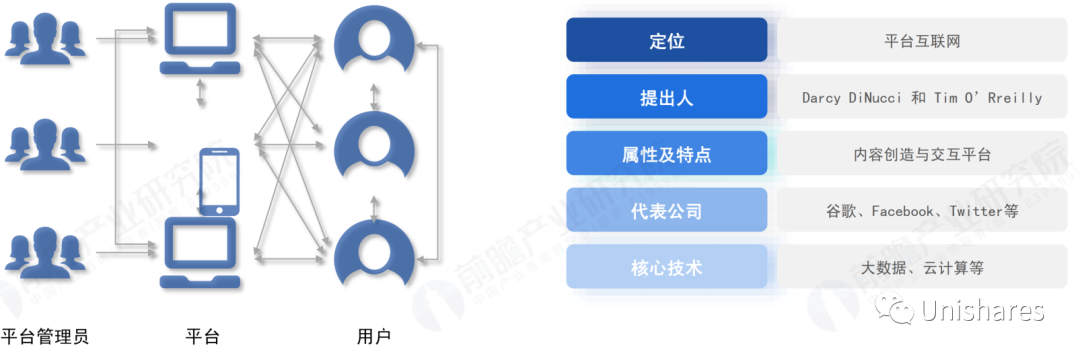 从2004年至今,都处于Web2.0时期,该时期定位平台互联网,为中心化模式。内容由用户创造,平台拥有。收益由平台分配。代表企业有谷歌、 Facebook、 Twitter等。相关核心技术包含大数据、云计算等。
