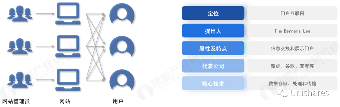 Web1.0大约从1991年持续到2004年,定位为门户互联网,为中心化模式,网站信息通常以文本或图像的形式呈现,用户为内容消费者,被动接受网站提供的信息。代表企业有雅虎、谷歌、百度等。相关核心技术包括数据存储、处理和传输等。
