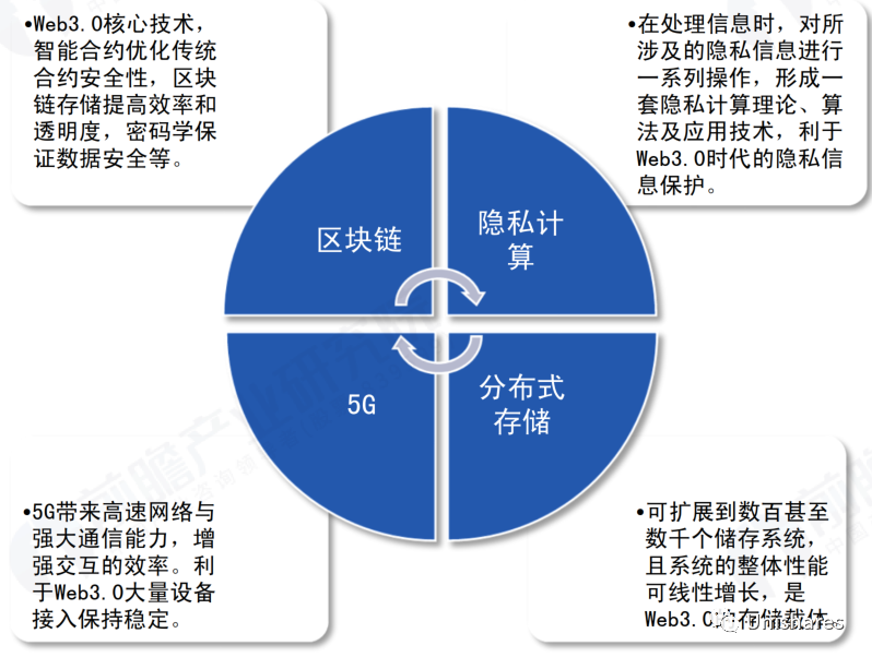 Web3.0的基础层的技术多样,其中关键的技术有区块链、隐私计算、分布式存储、 5G等。另外包括边缘计算、密码学、智能合约等技术。基础层的技术奠定了Web3.0产生及发展基本。