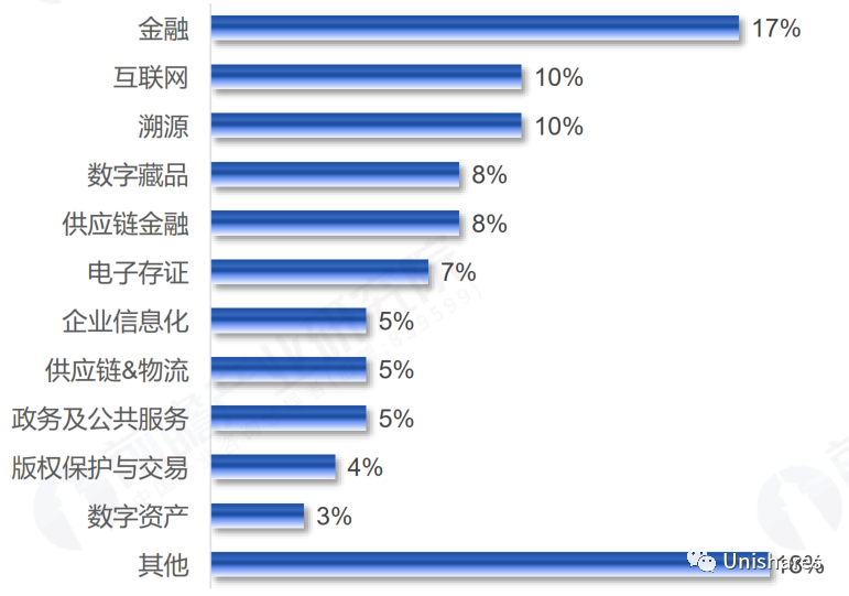 国内在Web3.0时代的典型应用主要利用区块链进行细分场景落地,当前区块链已经形成了链上价值转移、链上协作、链上存证三种典型应用模式。截至2022年10月,我国区块链信息服务备案中,主要分类有金融、互联网和溯源等,其中金融类型占比为17%。
