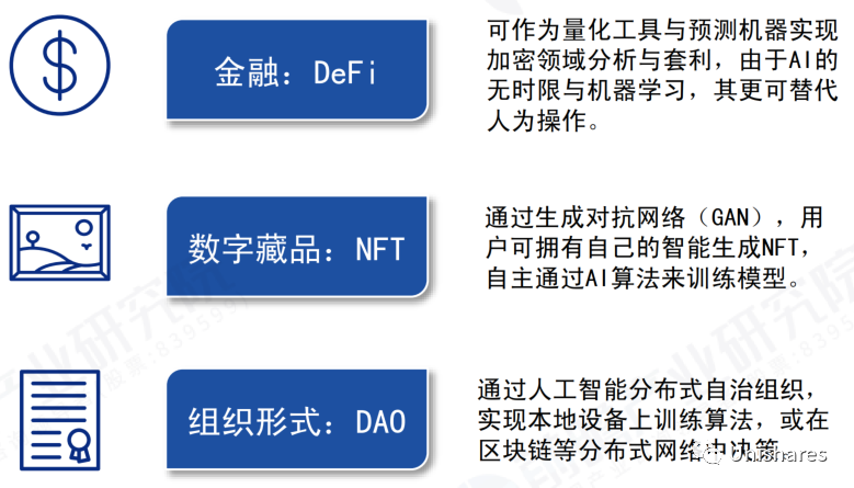 Web3.0与人工智能发展相辅相成。Web3.0时代,为人工智能发展提供更低的成本和更广的算力等优势。人工智能将不再限于专用场景,比如视频识别等,拓展至金融、数字藏品、虚拟人甚至组织形式,为Web3.0的应用拓展助力。