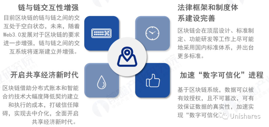区块链在Web3.0时代使得内容拥有者由Web2.0的平台变成了用户,且实现去中心化。但是,由于目前链与链之间独立,搭建安全、高效的跨链系统是未来区块链主要的发展方向之一。另外,在数字可信化以及共享经济方面,区块链将发挥重要作用,针对区块链的法律法规体系也将逐渐完善。