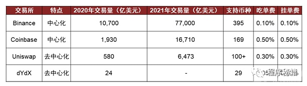 去中心化交易所(DEX):类似自动售货机,用户可以在智能合约的辅助下自主完成整个交易过程,而不必将其资金的控制权交给任何中介或托管人,典型案例为Uniswap等。