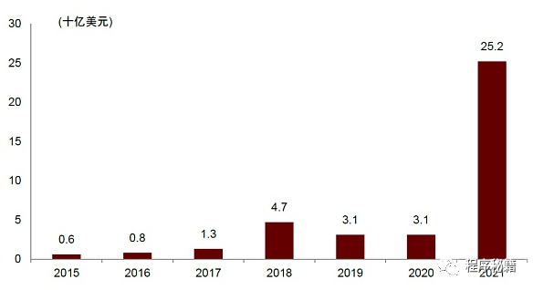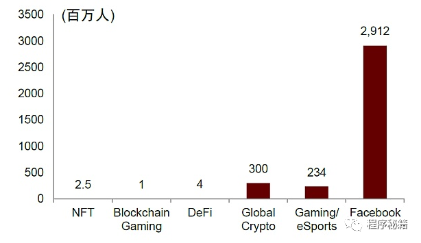 Web3.0目前发展势头猛,但发展阶段早。Web3.0在2021年元宇宙概念获得关注之际获得了大量的融资,根据CB insights数据显示,2021年全球区块链初创企业融资金额达252亿美元,同比增长超700%。强大的资金流意味着强大的人才流,同时Web3.0的使用者在快速增长,因此Web3.0同时具备了供给端和需求端的增长动力。但相比于成熟2.0时代大厂,Web3.0不论从用户规模还是市值来看仍然较小,属于成长早期阶段:目前Web3.0中用户最多的是数字货币使用者,约3亿人,距离Facebook的MAU(29亿人)仍有较大差距;其次是DeFi、NFT,均在百万人次的量级。