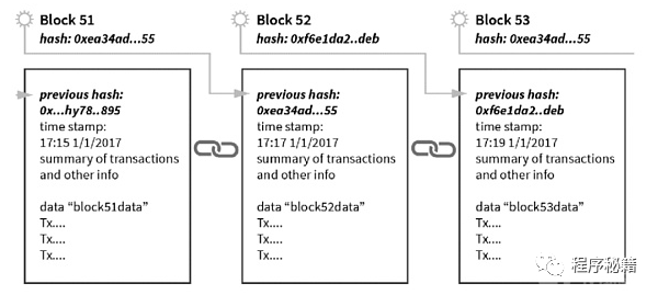 图表:区块链中区块的连接方式(每一个区块包含了前一个区块的Hash值)