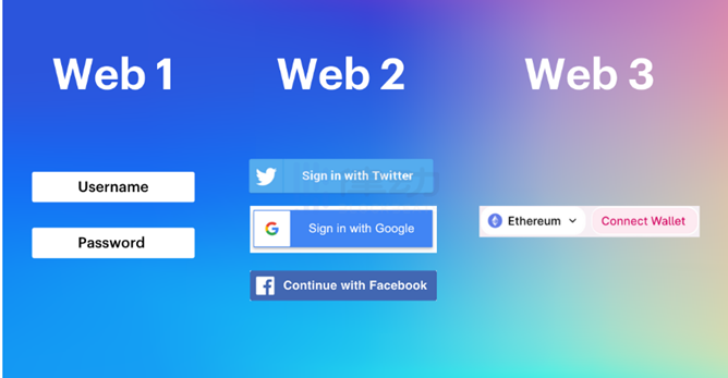 如图6所示,在Web 1.0阶段,用户使用用户名和密码登录账户;当进入Web 2.0阶段,用户无需再为记录账号及密码发愁,也无需因重复输入身份信息而烦恼,只需要点击Sign in with或Continue with授权Twitter、Google、Facebook等应用的账户信息,让身份数据通过API、SDK被其他应用抓取或读取,在没有输入账户名和密码的情况下完成用户身份的验证。这种方式虽然提升了用户体验,但换之而来的是Twitter、Google等互联网巨头采集到更多的用户行为数据。无论Web 1.0还是Web 2.0,用户数据都存储在中心化服务器里,用户缺少控制权。