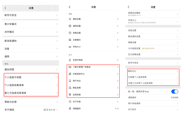 (资料来源:微信、抖音、知乎应用设置界面截图)