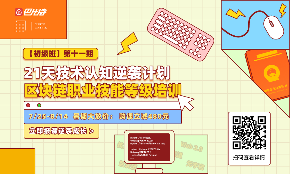 2022年7月25日,由巴比特与纯白矩阵联合开发的区块链职业技能等级培训初级班第十一期即将上线。课程将帮助对区块链代码实操和应用感兴趣,有志于转行区块链技术开发,或是区块链产业、Web3创业的学员,搭建包括行业全景扫描、政策监管分析、底层逻辑详解、实操应用指导、技术开发实践在内的系统知识。